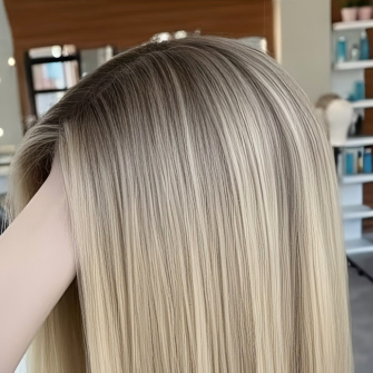 - Stunning Ash Blonde Balayage: Features a natural dark root that seamlessly transitions into a multi-dimensional, cool-toned ash blonde. The professional balayage and subtle highlights add depth and a sophisticated, modern finish.
